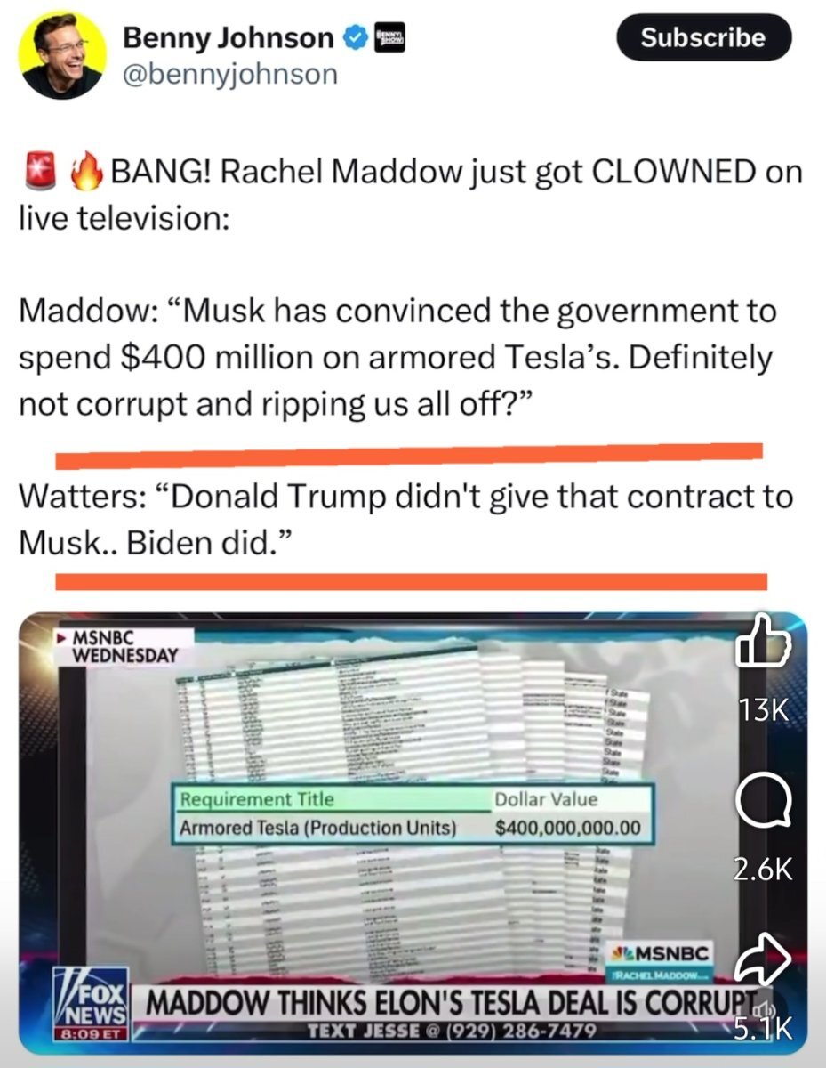 March 2, 2025Mar 2 11 minutes ago, lynched1 said: Actually the contract Biden awarded was valued at $483K for light duty vehicles to test for government use (like to get to work in DC during rush hour). But Elon and his pimple faced nerds from the island of misfit tech crap decided to change the value to $400m and forward it to Tesla. Then the public that has a brain said "wait what?” And they turtled up like a bunch of sissies on a playground and said "oh no we would never do that so we won’t be moving forward with it.” you’re so Fing stupid man, how do you even manage to get dressed in the morning? https://www.npr.org/2025/02/24/nx-s1-5305269/tesla-state-department-elon-musk-trump