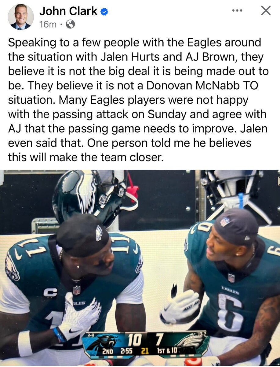 December 12, 2024Dec 12 On 12/10/2024 at 6:32 AM, DBW said: He also didn’t say PASSER people are taking what he said and making it what they want it to be…what the city feeds off of….drama. On 12/10/2024 at 5:22 PM, brkmsn said: You are correct, but he knows this media and fan base pretty well. If you don't want controversy, guard your words. I saw Smith make comments after the game and he later clarified he was talking about himself. Has Brown made any clarification or it just one of those things where, "I said what I said." ? As far as I know, Jalen and AJ are friends. It appears that Brown is frustrated and this isn't the first time that's happened as an Eagle. The last time was supposedly about targets. So it's reasonable to think that it's the same thing again. The difference is we have a legit MVP candidate in Barkley that is eating up potential pass targets and the success around his touches doesn't really provide reason to limit those and feed AJ more. Everybody, especially the captains of the team, should be on board with winning. So today, he did clarify his comment. I, for one, appreciate what he said today. Very professional.