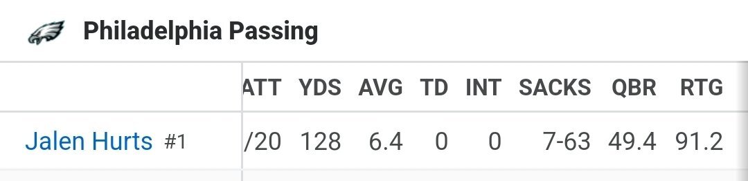 It's hard to look at such low QB numbers, and we expect more with the talent they have. But he did throw for over 300 once this year (311), noteworthy that AJ Brown did not play that game (Goedert had a huge game plus Smitty, even Parris Campbell and Dotson had catches). They barely won 15-12. In the opener vs GB he threw for 278, vs Browns 264 and the 290 against the Steelers who are a good defense.