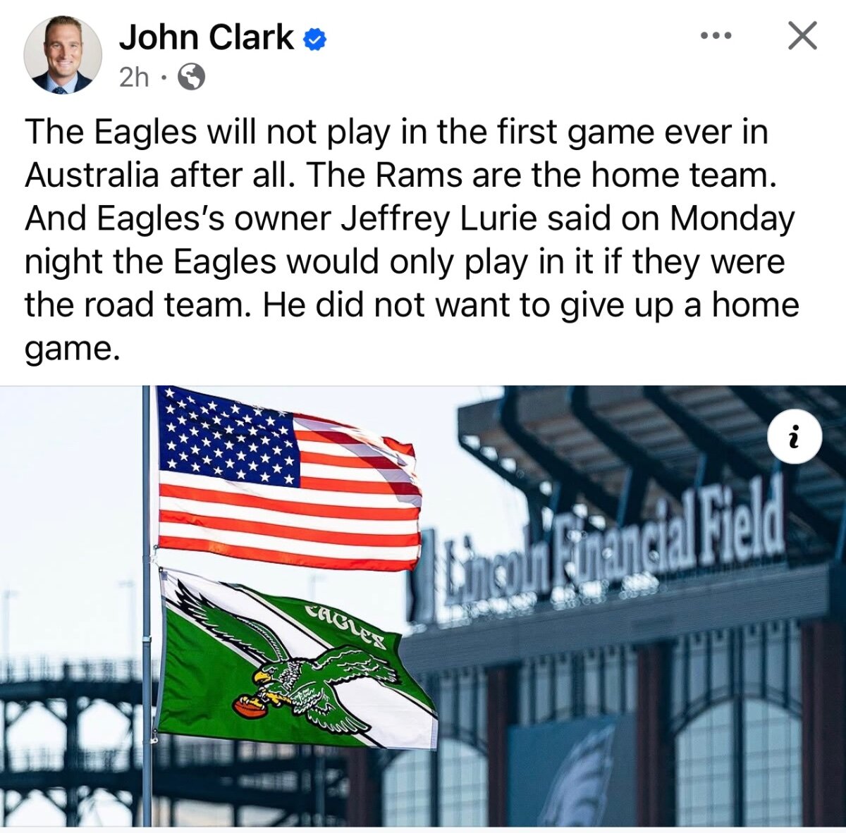 February 5Feb 5 Author Winds up that the initial story may be incorrect. Jeff Lurie stated the Eagles weren't giving up a home game, and the latest reports that it'll be a home game for the Rams in Australia in 2026. So maybe the Eagles won't be playing there after all - or if they do play there, maybe it's not against the Rams.