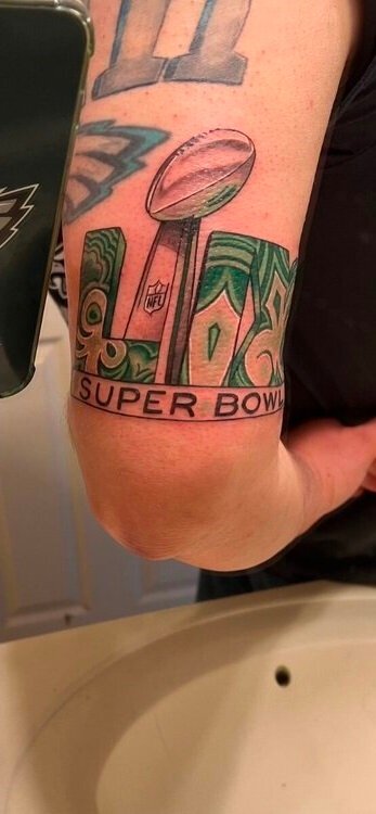 March 1Mar 1 Dang, great tattoo. Love the SB logo color change to be Iggles colors!! I have bought no SB gear, it's just not my thing. Maybe if there was a Kelly Green hoodie/Black long sleeve shirt, I might be interested.