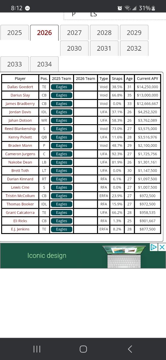 February 17Feb 17 4 minutes ago, UK_EaglesFan89 said: Damn is he really? I mean depending on what the dead cap hit is I think he’s a prime candidate to be cut. 2026 salaries, 2026 would be their final season. Slay and brad at the top https://overthecap.com/free-agency/philadelphia-eagles