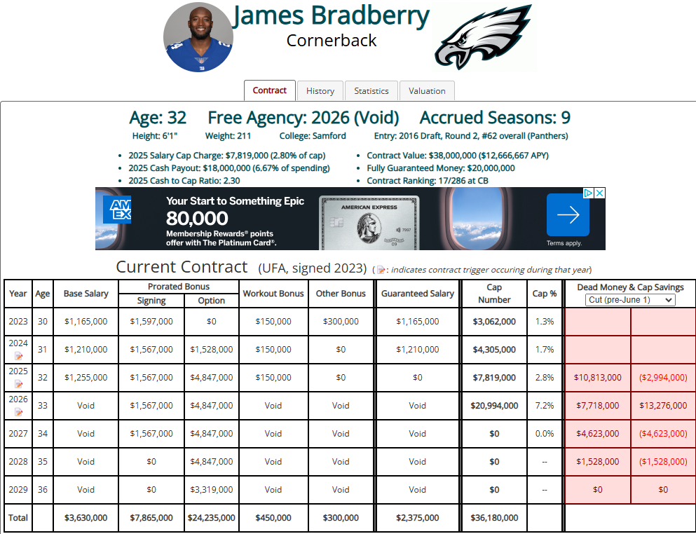 February 17Feb 17 Author 9 minutes ago, EagleMatt said: Any chance bradberry is let go too? Hes on the books for 12m or something like that? OTC shows a cap hit of $7.8M for 2025: Whether he is cut or traded with a post June 1 designation results in the same ($3.1M in a dead money hit to the 2025 cap but $4.7M in cap savings):