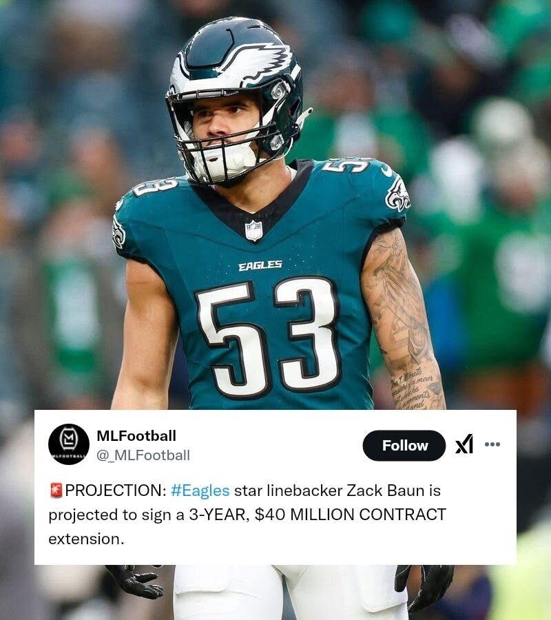 February 19Feb 19 Some information from Pff regarding projections of the big 3 on defense. LB ZACK BAUN PFF Contract Projection: Available in PFF's free agency rankings No defensive player upped their value more in one season than Baun. The 28-year-old squeezed everything out of his one-year deal with the Eagles, becoming the centerpiece to one of the best units in the league — and one of the foremost players in his own right. Baun’s 90.2 PFF overall grade and 91.2 PFF coverage grade both led qualified linebackers, and he also missed just 10.7% of tackle attempts. Linebacker play can fluctuate year over year, and Baun has to prove he’s more than a flash in a pan in 2025. Still, he could easily become one of the three highest-paid linebackers in the league with an $18 million annual EDGE JOSH SWEAT PFF Contract Projection: Available in PFF's free agency rankings While his teammate Baun was a 2024 revelation, Sweat has become an underrated standout over the past few years. Since 2022, Sweat ranks 15th in total pressures generated and 27th in pass-rush win rate among all qualified defenders. His run-defense marks haven’t been as strong since his great 2022 campaign, but Sweat still missed only 5% of tackles this year. Still only 27, Sweat matches the description of a player whom teams will covet this offseason. Lavishing him with an offer of $22 million or more per year is in play. DI MILTON WILLIAMS PFF Contract Projection: Available in PFF's free agency rankings A third straight Eagle might seem preposterous, but that’s really how good Vic Fangio’s defense is. Even in playing just 628 snaps across a deep defensive line, Williams has made an impact. His 91.0 PFF pass-rushing grade ranks second among all interior defenders, and his 17.5% pass-rush win rate slots fourth. Run defense has been more of a problem, as evidenced by Williams’ 41.7 PFF run-defense mark, but he’s still highly valuable, slotting seventh at the position in PFF's wins above replacement metric. Only 25, Williams can be overshadowed on a stacked Eagles defense but is assuredly appreciated around the league. The Louisiana Tech product will likely get at least $18 million per year.