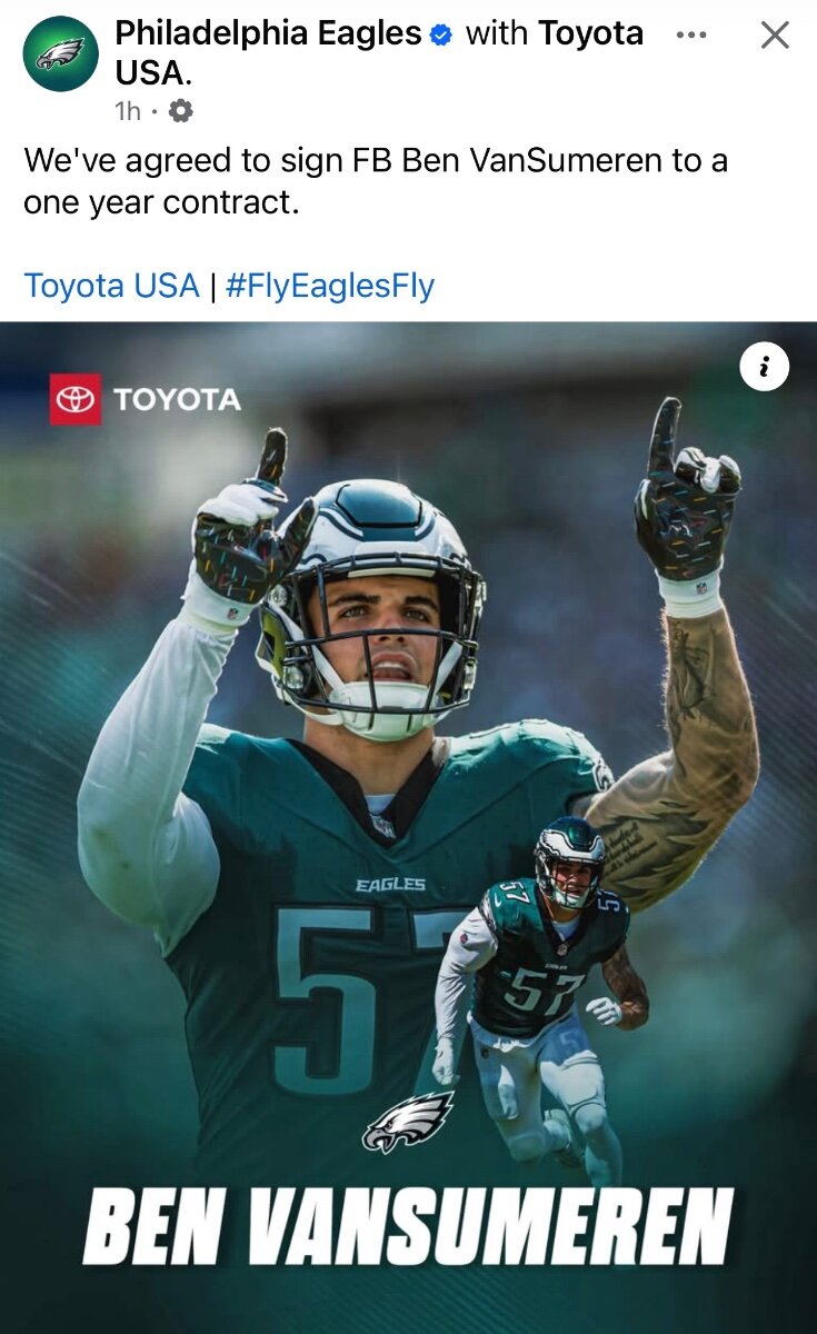 March 13Mar 13 1 hour ago, time2rock said: Possibly an under the radar type of move but BVS was signed to a new 1 year deal. I didn’t realize he was a RFA entering this new league year. Of further note he is now listed as a FB and no longer a LB. from: https://www.nfl.com/news/nfl-news-roundup-latest-league-updates-from-wednesday-march-12 Philadelphia Eagles SIGNINGS RB AJ Dillon is signing a one-year contract, NFL Network Insider Mike Garafolo reported. LB Ben VanSumeren is re-signing on a one-year, $10 million full guaranteed deal, NFL Network Insider Ian Rapoport reported. lol --- I'm pretty sure that's a typo. If not Howie is concussed from that beer can.