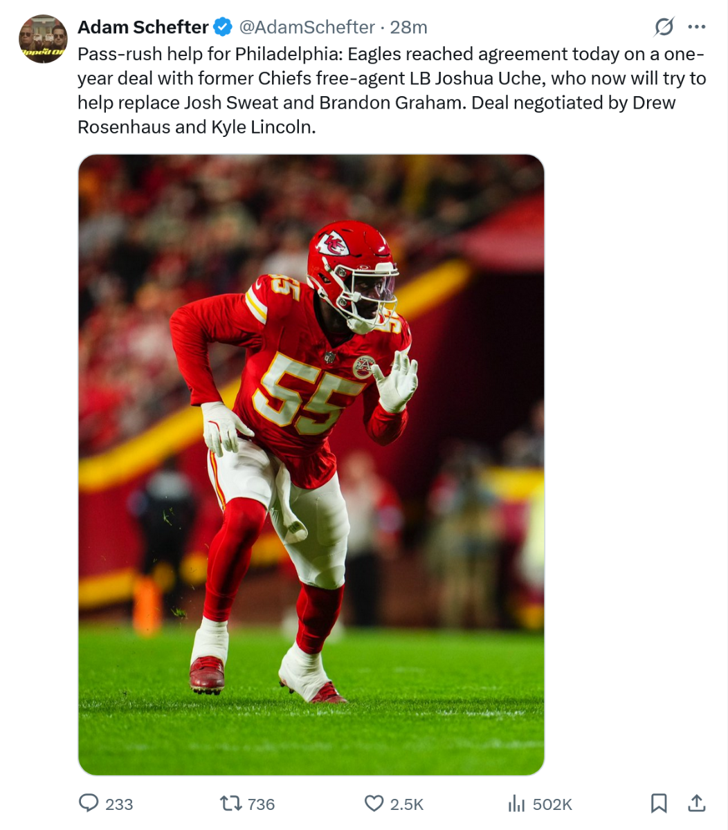 March 13Mar 13 3 minutes ago, Procus said: stockpiling picks translates into higher picks if Howie decides to use them to trade up which he likely would do Yeah, exactly what I was thinking. Even if it's not this draft, it could be next years. I definitely see the possibility of him doing what he did in 2018 and trade pick 32 and drop out of the first round and then possibly using the acquired picks to move up elsewhere, or get more picks in 2026. Of course in 2018, he traded 32 to the Ravens who got Lamar Jackson. Howie turned that into Dallas Goedert, Avante Maddox and Miles Sanders (and maybe more, it's too late to follow the entire trail lol). It sucks losing who we've lost, but it's in Howie's hands, and we can't ask for more than that.