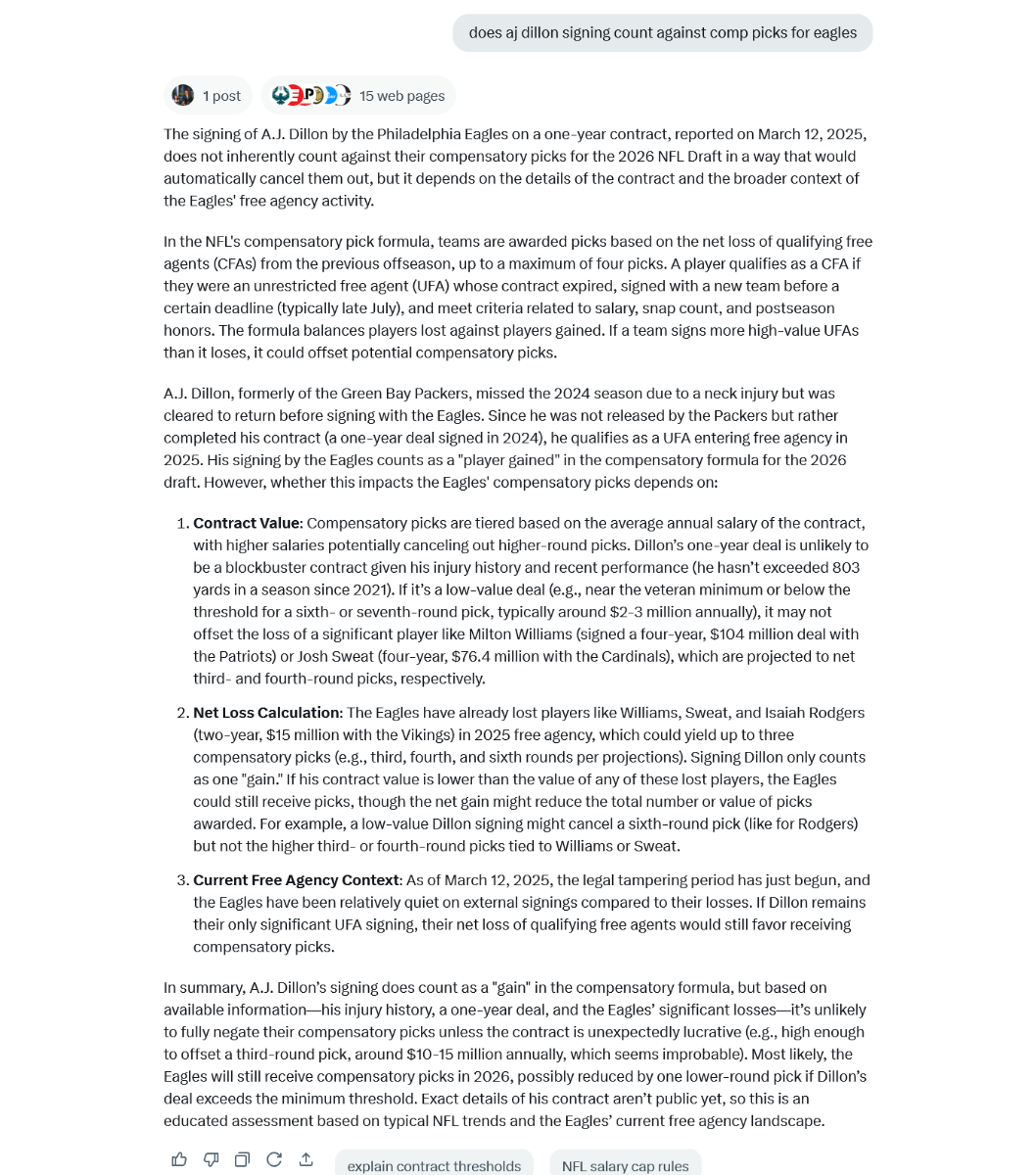 March 13Mar 13 32 minutes ago, brkmsn said: from: https://www.nfl.com/news/nfl-news-roundup-latest-league-updates-from-wednesday-march-12 Philadelphia Eagles SIGNINGS RB AJ Dillon is signing a one-year contract, NFL Network Insider Mike Garafolo reported. LB Ben VanSumeren is re-signing on a one-year, $10 million full guaranteed deal, NFL Network Insider Ian Rapoport reported. lol --- I'm pretty sure that's a typo. If not Howie is concussed from that beer can. lol Yeah, maybe it's a 10 year, $1 million fully guaranteed contract?