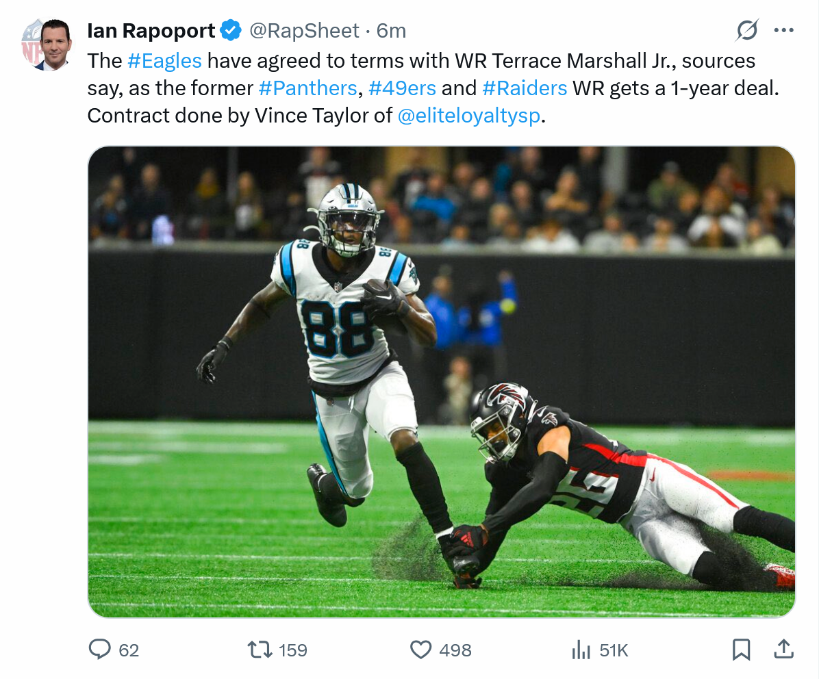 April 16Apr 16 On 4/10/2025 at 5:39 PM, Procus said:Marhsall was drafted in the second round by the Panthers in 2021.Not complaining about a dude brought in for competition on a one year deal, but I see a lot of WR needy teams on the list that have cut bait on him already. Doesn't exactly bode well for him.