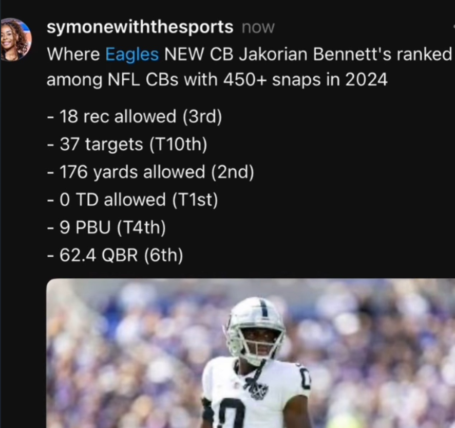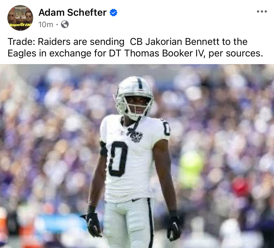 August 5Aug 5 Author Eagles acquire CB Jakorian Bennett from the Raiders via trade for DT Thomas Booker IV. Bennett is only 24 years old - drafted in the 4th round in 2023 so under control on rookie contract for 2 more seasons. I liked Booker but we had solid depth at iDL and no one seems to be running away in the competition for that CB2 spot so this seems like a win for both teams.