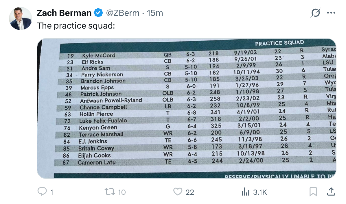 August 29Aug 29 Author 6 hours ago, Procus said:Britain Covey, Eli Ricks and other familiar names are on the practice squad