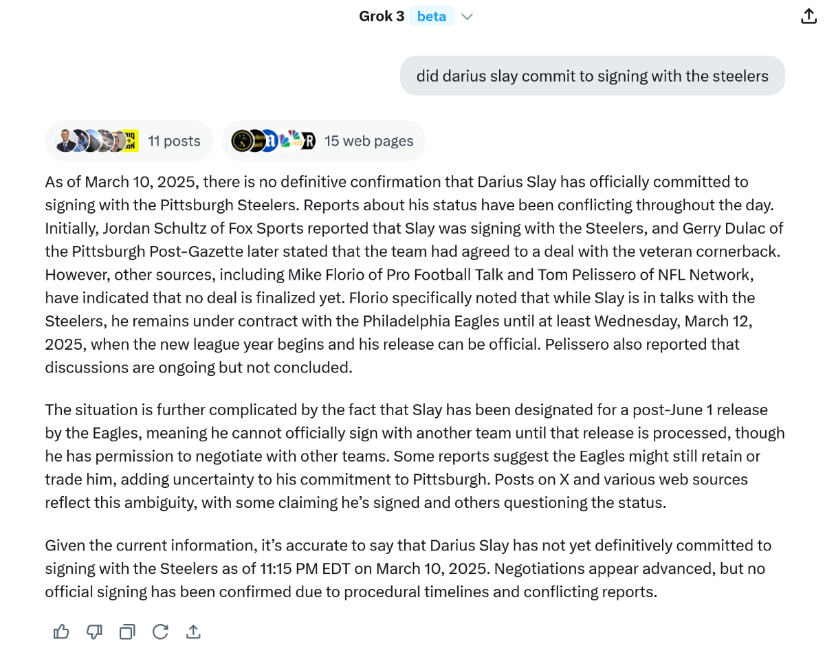 March 11, 2025Mar 11 Author 5 minutes ago, 20dawk4life said: Only problem with this is it’s Slay -> Rodgers -> Ringo Have to assume they are still talking to Slay - he hasn't signed anything with Pittsburgh (or elsewhere) yet. Technically he is still under contract with us until his release is official. Since he is entering the final year of his deal with a cap hit of $13.7M they could be trying to negotiate a new deal that would lower that cap hit.