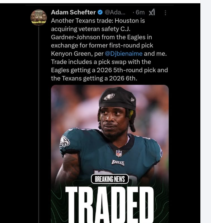 March 11Mar 11 https://www.nbcsportsphiladelphia.com/nfl/philadelphia-eagles/cj-gardner-johnson-kenyon-green-trade-free-agency-texans/653665/ A big part of this trade is giving former third-round pick Sydney Brown a chance to compete for a starting spot next to Reed Blankenship in the Eagles’ defense. Brown was a third-round pick out of Illinois in 2023 but hasn’t yet carved out a significant role on defense. He showed some promise as a rookie but tore his ACL in the regular season finale and missed the start of 2024 before bing buried on the depth chart. In addition to Brown, the Eagles also still have Tristin McCollum and Lewis Cine on the roster. There are also several months before the opener, so it’s possible the Eagles could add another safety. And Blankenship, 26, is entering the final year of his contract. So an extension could be coming for the now-veteran starter. Green, 23, was the No. 15 overall pick out of Texas A&M back in the 2022 draft but his NFL career hasn’t gone to plan. After starting 14 games as a rookie, with plenty of struggles, Green missed the entire 2023 season with a shoulder injury. In 2024, Green was benched in October. He ended up playing in 12 games with 9 starts. Last season, ProFootballFocus ranked him as the No. 76 best guard in the NFL out of 77 qualified players. Green gave up 47 pressures and 4 sacks last season. He appears to be another reclamation for highly regarded offensive line coach Jeff Stoutland. Green has played only left guard in the NFL and the Eagles have Pro Bowler Landon Dickerson at that spot. So perhaps we see him get some time at right guard, where there’s an opening. The Eagles’ 2024 starter, Mekhi Becton, is a free agent. The Eagles also have 2023 third-round pick Tyler Steen on the roster.