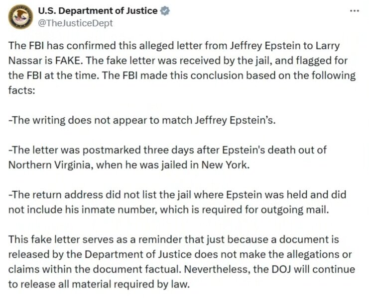 December 25, 2025Dec 25 Author All those things debunked and the handwriting analysis hasn't been published. If it was fake then why did the DOJ release it? The odds are in favor that the letter is real.