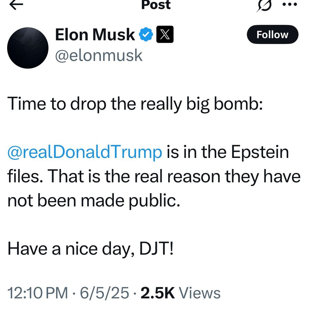 June 5, 2025Jun 5 1 minute ago, Alpha_TATEr said:@Procus you going to allow elon to drop truth bombs on ya daddy like this?I'm guessing there are some folks you won't see for a while here after the past few days.