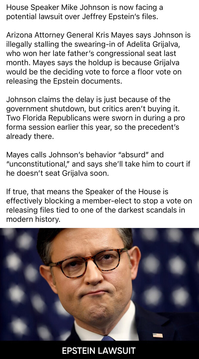 October 10, 2025Oct 10 On 10/3/2025 at 7:54 PM, lynched1 said:Something to look forward to once Schumer reopens the governmentReps. Thomas Massie, R-Ky., and Ro Khanna, D-Calif., needed just one more person to sign onto a petition aimed at forcing a vote on the Epstein files — a signature they would have gotten if Rep.-elect Adelita Grijalva, D-Ariz., was sworn in next week following her special election victory.Here you go little buddy…