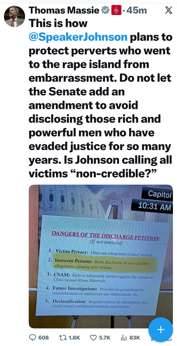 November 18, 2025Nov 18 1 minute ago, JohnSnowsHair said:To be fair, Johnson's not wrong about that. Releasing documents that may result in allegations that are not credible makes victims of those who are truly innocent.Massie assuming everybody connected to Epstein is by default guilty is the complete opposite of how our justice system is supposed to function.But this is what having a stupid narcissist autocrat who thinks he can say anything and not pay the consequences in the White House does. He got hundreds of thousands if not millions to vote for him by fostering this idea that he's some kind of "law and order" candidate and will "bring justice" to Epstein's victims by releasing the "Epstein files". Then fought tooth and nail not to release the files.We get the government we deserve. Because MAGA mouth breathers needed their autocrat.Exactly. Trump is already smearing people by saying they're on the list and even campaigned on it. People not proven guilty in the courts. So cats out of the bag on the whole "don't give out names of potentially innocent people".