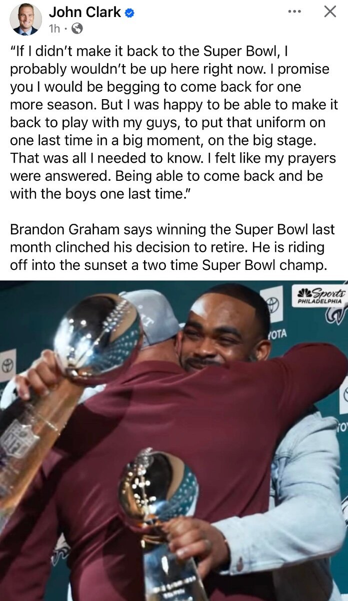 March 20Mar 20 I think it's the perfect time to retire. It's clear we had to reload on defense. I'm not one to doubt this staff after the amazing job they did last year, but it's a tough ask to take all these pieces and turn them into rising stars like they did last year. He goes out on top delivering the cities only two Lombardi's. What more could you ask of a Philadelphia hero. Thank you Brandon Graham. He may be retired but the memories and moments he created will live on in Philly sports history forever. A true legend in this town.