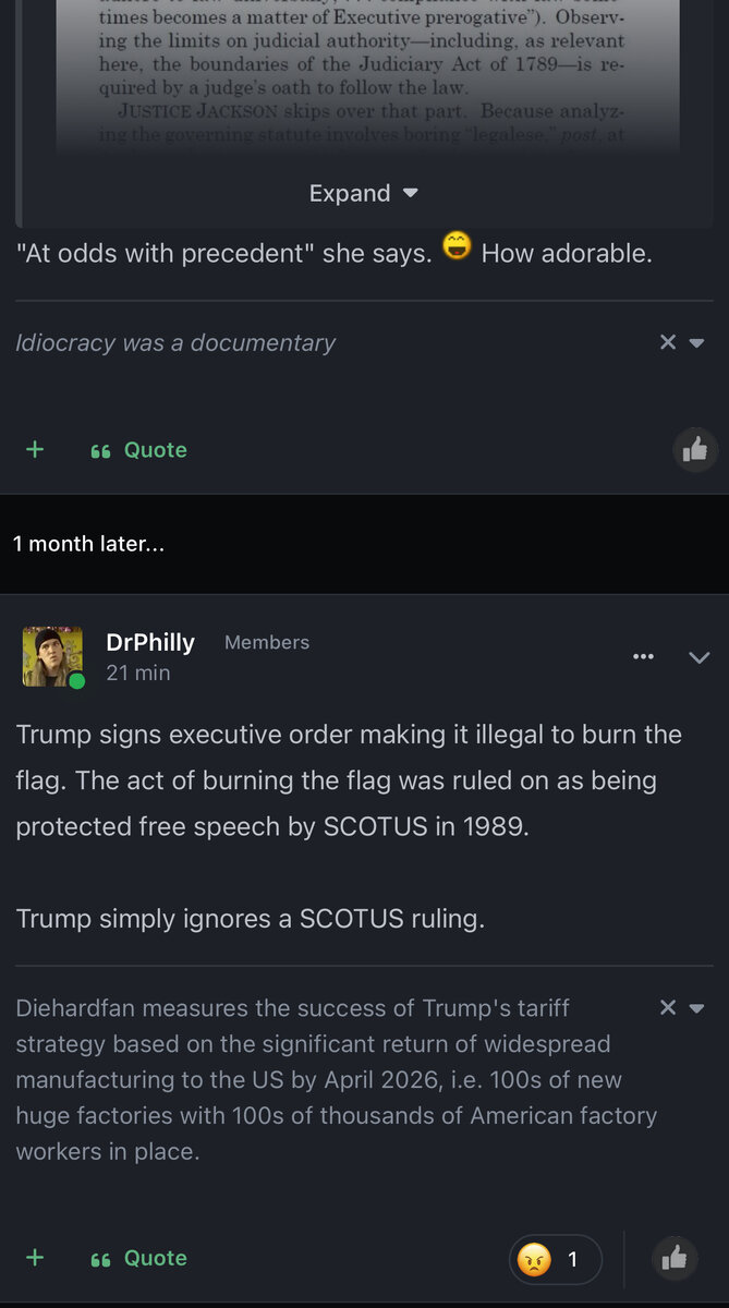 August 25Aug 25 4 minutes ago, DrPhilly said:Trump signs executive order making it illegal to burn the flag. The act of burning the flag was ruled on as being protected free speech by SCOTUS in 1989.Trump simply ignores a SCOTUS ruling.I never had the desire to protest my country enough to burn the flag, but I almost want to burn one now. The flag itself is a piece of cloth that can be replaced. Granted, some actual flags have historical value and should be protected. But overall, what needs protected is what the flag represents, and that ironically, means being free to express yourself anyway you want, if it doesn’t harm others. It’s already been established that feelings are for snowflakes so if some burning a flag hurts your feelings, I don’t GAFF.
