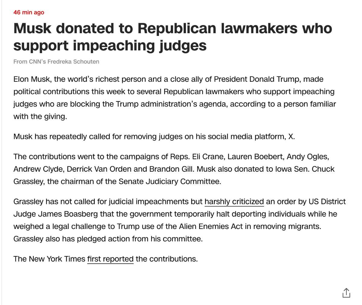 March 20Mar 20 2 minutes ago, DrPhilly said: Musk doesn't understand the judicial process so well. If he did, he'd realize that impeachment would be an exercise in futility and would just be a proceeding for show. You'd never get a vote of 2/3 of the Senate to convict and remove.