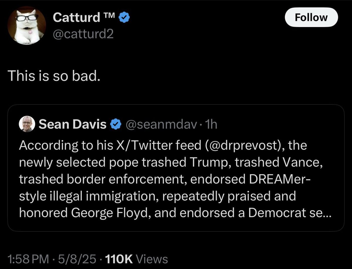 May 9May 9 8 hours ago, lynched1 said:Even the pope is made in the USA....but he gets some of his parts from foreign countries, am I right?