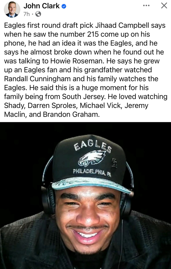 April 25Apr 25 Love the pick, assuming his shoulder injury/surgery heals 100% and he can contribute this year (which is the expectation). Certainly didn't see this coming, though. Howie continues to surprise by how he's evolving and moving away from some past stubbornness...paying a RB and LB big money, now drafting a LB in Round 1, etc. I liked the way Campbell spoke and acted during the post-selection interview. He seemed genuinely excited and his talent should make him a long term player in Philly.