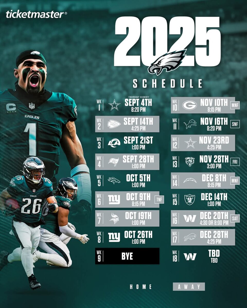 May 14May 14 36 minutes ago, time2rock said:Updated schedule so far:Week 1 — Thurs, Sep 4 vs. Cowboys (8:20 p.m. on NBC10/Peacock)Week 2 — Sun, Sept. 14 at Chiefs (4:25 p.m.)Week 3 —Week 4 —Week 5 —Week 6 — Thurs, Oct. 9 at Giants (8:15 p.m. on Prime Video)Week 7 —Week 8 — Sun, Oct 26 vs GiantsWeek 9 —Week 10 — Mon, Nov. 10 at Packers (8:15 p.m. on ESPN)Week 11 — Sun, Nov 16 vs LionsWeek 12 —Week 13 — Fri, Nov. 28 vs. Bears (3 p.m. on Prime Video)Week 14 — Mon, Dec 8 at Chargers (8:15 p.m. on ESPN)Week 15 — Sun, Dec 14 vs RaidersWeek 16 — Sat, Dec. 20 at Commanders (on FOX)Week 17 — Sun, Dec 28 at BillsWeek 18 — date TBD vs CommandersThis explains likely why the Commanders were not scheduled for the opener. They wanted a game that could be for the NFC East that could be slotted as the final game of the regular season in Week 18 on Sunday Night Football. I suspect they also did that in case President Trump did an Executive Order that would block the NFL from having games on December 20, when three first-round games in the College Football Playoff take place (the other Friday 12/19) with those games moved to Sunday 12/21. I can see Trump actually going there because of his almost 45 year vendetta against the NFL that goes back to 1981 when he attempted the buy the then-Baltimore Colts with George Allen for a then-record $50 Million that was rebuffed by the Irsay family. Trump I can see doing that and bragging how he "prevented the NFL from ruining the College Football Playoff" by not allowing them to play that day, effectively expanding the Sports Broadcasting Act of 1961 that bans the NFL from televising NFL games nationally from the 6:00 AM Friday-11:59 PM Saturday on the second Friday in September through the second Friday in December to add the College Football Playoff to that.