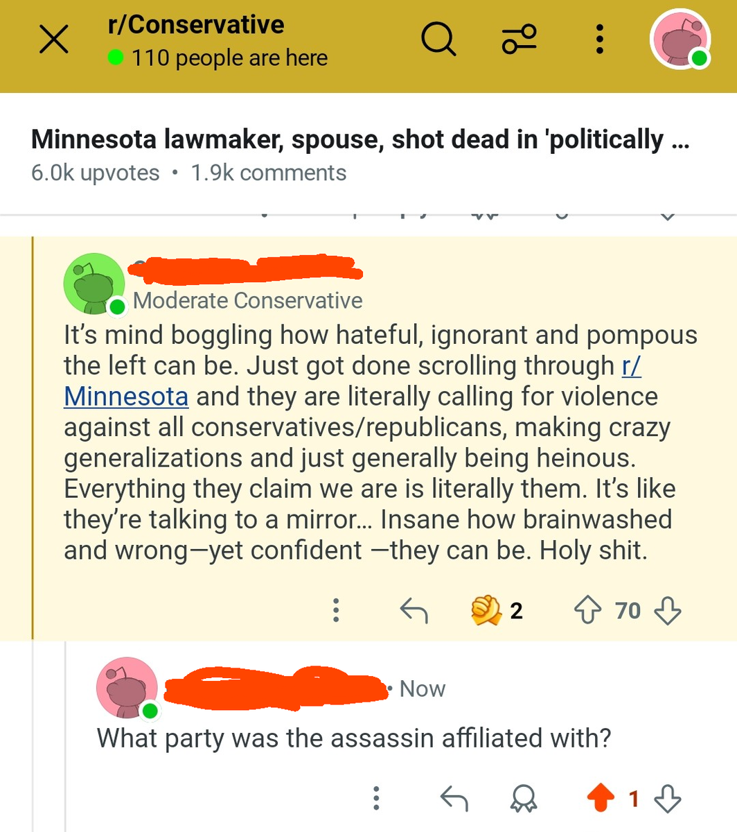 June 16Jun 16 55 minutes ago, Gannan said:Time to call this for what it is... Radicalized Ultra Maga Domestic TerrorismIf we're being completely honest with ourselves, we know that in their most private of moments, most MAGAs aren't bothered by what's happening. They want a white, Christian ethno state run by a strongman. They're just less inclined to do the hard work themselves. The more I've sat back and resigned myself to the reality that there are more people in this country that hold beliefs like Boelter and not like me, I start to realize that they're all after the same end goal. It's all the same politics... which is deport, marginalize, attack, and in rare cases like this one, execute anyone who gets in the way.
