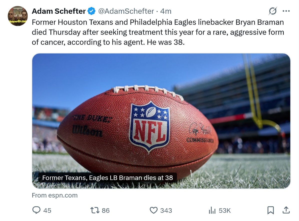 July 25Jul 25 Another great person lost to this horrible disease. Rest in Peace Bryan. You will always be a Philadelphia Eagle.