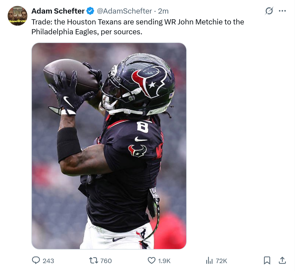 August 17Aug 17 All we did was a late rd pick swap and trade away a player that wasn't going to make the 53. We get a chance to evaluate a legit slot receiver for at least a couple weeks. There is a possibility that the Eagles may be working on another trade. But I think they had an opportunity to get a player they liked for virtually nothing. My understanding, though, is that we outbid the whiners to get Metchie. Read into that what you want.