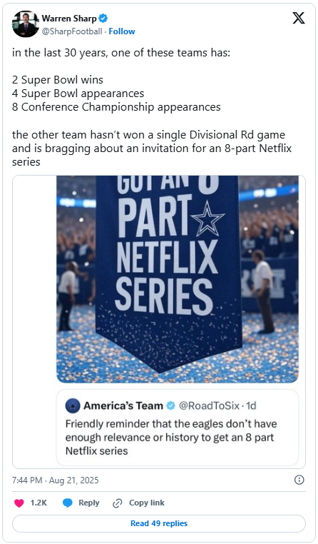 Posted August 22Aug 22 MoneyballPosted: August 21st, 2025 | Author: Tommy LawlorThe Eagles have some holes on the roster that could have been filled by keeping certain players around. So why did Howie let the veteran players leave and take chances on replacing them?Money.The Eagles have some of the highest paid players in the league.Jalen HurtsLane JohnsonSaquon BarkleyAJ BrownZack BaunJordan MailataLandon DickersonDeVonta SmithThey also have some terrific young players who are going to need big paydays in the next year or two.Jalen CarterNolan SmithQuinyon MitchellCooper DeJeanDarius Cooper (just checking to see if you’re paying attention)In order to pay star players star money, you need some cheap solutions. You can go with mediocre veterans or you can take a chance on young players. Howie Roseman and the Eagles are focusing on youth. If you hit on some of those players, they can be hugely impactful.There is no question that Howie would have rather kept Darius Slay and Isaiah Rodgers instead of going with Kelee Ringo and Adoree Jackson. But money changes things. Not just the salary cap, but how much actual money is spent. The Eagles are always near the top of the league in cash spent. It can be challenging to keep doing that.There is risk in this approach. When you go with young players you are taking a chance. Kelee Ringo has not taken advantage of the opportunity the team gave him. He still might pan out this year or down the road, but you certainly can’t trust him right now. The Eagles took a chance on Tyler Steen at RG and he has panned out so far. Steen had the best camp of his career and looks ready to be a full-time starter.It is frustrating when a player like Ringo fails to step up. Still, you have to take those chances. The worst thing you can do is fill your roster with "safe” veterans, guys who are effective, but have a ceiling. Sometimes even they don’t pan out and you’re stuck with a mediocre player. He can help you be around a .500 team, but isn’t likely to get you to the big game. You must take some chances.The Eagles scouting staff has done a great job in recent years of finding talented young players. The coaching staff has done a great job of developing those players. That’s how you build the best roster in the league.The team got several good answers from young players last year and that helped the Eagles win the Super Bowl. If the team can get some more good answers this season, the Eagles will remain near or at the top of the league.*****The final preseason game is on Friday. The Eagles will be judicious about who they play. They won’t want to risk a key backup or role player getting hurt unless that person desperately needs the reps. Expect all the CBs to play so the coaches can get another look at them. I lean toward Jakorian Bennett at this point, but Adoree Jackson still might win the job. It would be great to see rookie Mac McWilliams come out and have a strong performance.Kyle McCord should play a lot. He needs the experience and the team will want to see what he can do in his third game. He got better from Week 1 to Week 2. He’s also had some good practices recently.I’ll be interested to see what happens on the OL. Will Darrian Kinnard get reps at LT? LG? Will the coaches just play the rookies a ton?Let’s just hope there aren’t any key injuries and that the game is more entertaining than last week’s debacle.*****This is fantastic.Jerry Jones team is worth more money. He’s richer than Jeffrey Lurie. That doesn’t mean a thing to anyone but them and their families. The rest of us can actually focus on…winning and losing. What a novel idea.The Cowboys can have their Netflix series.The Eagles will have to settle for Super Bowl parades.http://igglesblitz.com/2025/08/moneyball/