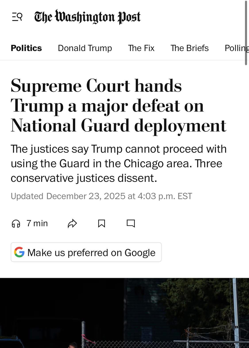 December 23, 2025Dec 23 SCOTUS just ruled against the Trump WH in his bid to have them overturn earlier rulings regarding the attempt to put the Nat Guard in Chicago