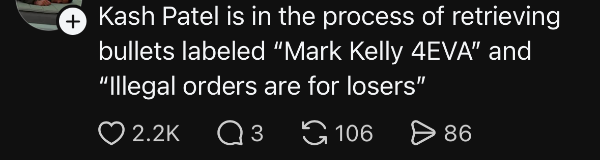 November 27, 2025Nov 27 6 minutes ago, Gannan said:They aren’t law enforcement. They aren’t being given any mission parameters. Trump wants them roaming the streets aimlessly just to look scary. He’s making them targets.And none of that has anything to do with trying to put the blame on Trump when some lunatic murders someone.