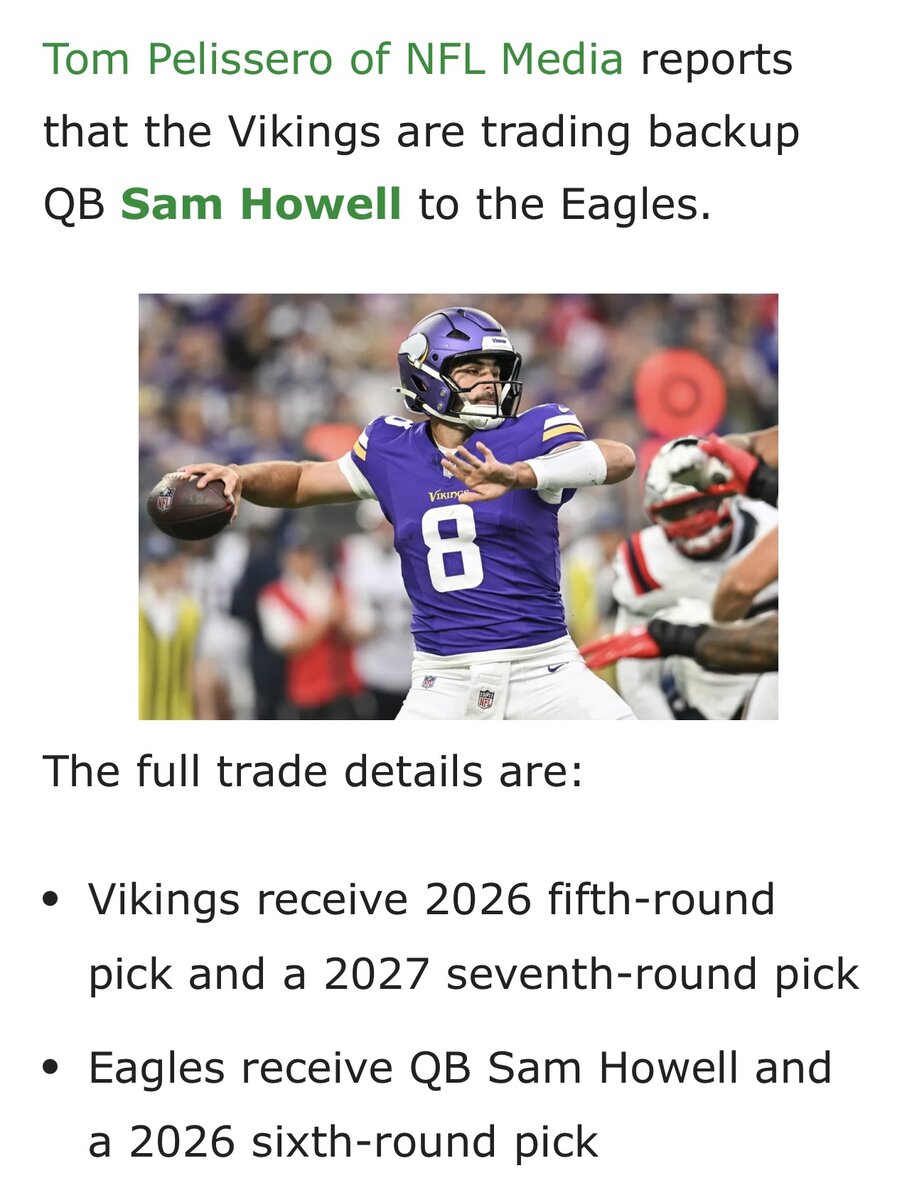 August 25Aug 25 Actually like this trade. I think it serves 2 purposes....1 is the McKee finger injury and having Howell is better than running McCord out there at any point. 2 is that next offseason, assuming Howie finds a way to keep Howell, it gives them some cushion for trading McKee for a decent draft pick.