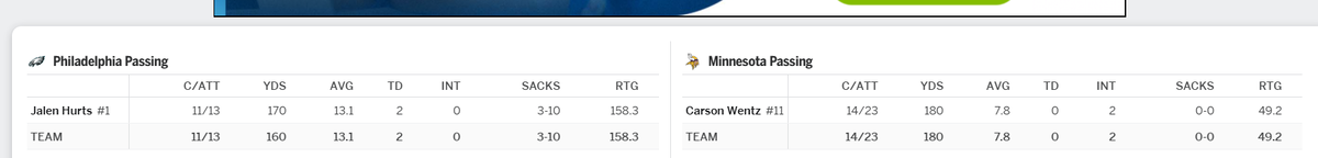 Sunday at 06:56 PM5 days Jalen Hurts 84.6%, 170 yards, 13.1 ypa, 2 TD, 0 int, perfect 158.3 QB rating.