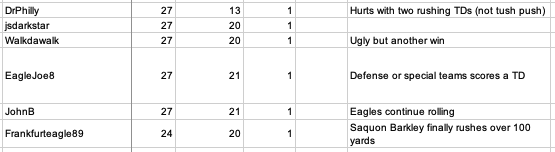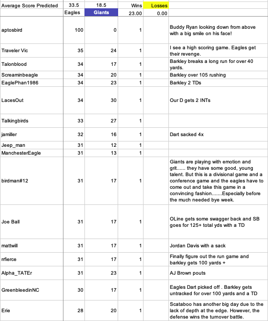 16 hours ago16 hr Friday Morning Eagles-Giants Week Eight Game Score Predictions Update - 49 hours until Kickoff23 predictions recorded. All 23 are for an Eagles win. The average predicted score is Eagles 33 Giants 18.I believe I got everyone's prediction. If you don't see your name below, I either missed your prediction or you haven't submitted one yet.As always, please tag your prediction post with @mattwill that way I will be sure to see/record it. Score predictions can also have an optional "Bonus Pick" tiebreaker prediction. I will be taking predictions right up until Kickoff.The list of the 23 predictions that are recorded is presented below, sorted high to low by Eagles points predicted.
