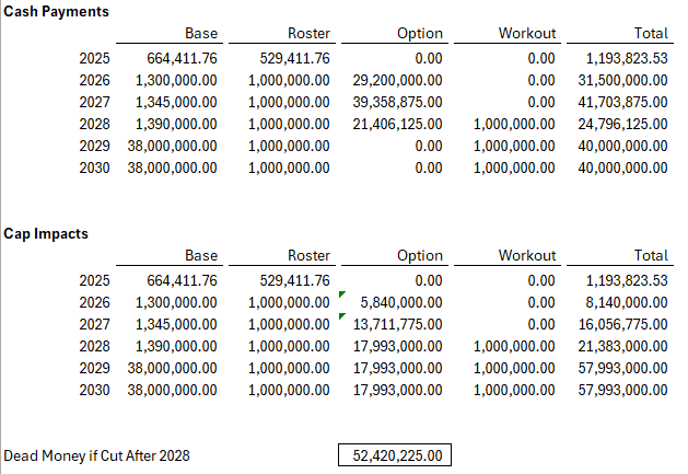 7 hours ago7 hr Again, while I see zero chance of it happening, if there's one player I'd give up that kind of haul for -- it's Myles Garrett. Cap numbers of $8.1mm in 2026, $16.1mm in 2027 and $21.4mm in 2028 are manageable, and he's out of guarantees after that and you move on and eat $52.4mm in 2029. As a side note, we have an OBSCENE amount of dead money that will hit in 2029 already with Jalen and Smitty unless extended. But that's also when the new TV deals should hit.