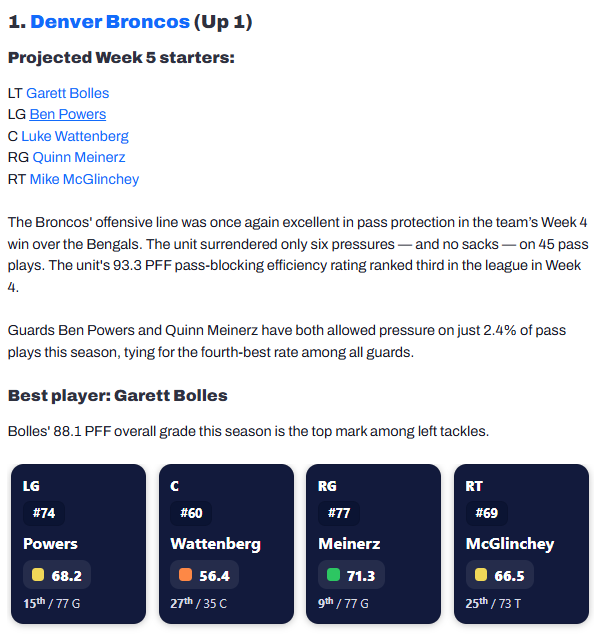 13 hours ago13 hr 1 minute ago, Waiting4Someday said:By other 'metrics' it seems like the Broncos OL is doing well...Uploading Attachment...The Broncos have the advantage on both lines this week. I posted during the MNF game that the Eagles should walk the Broncos, but if the lines don't come to play, it could be a long Sunday.