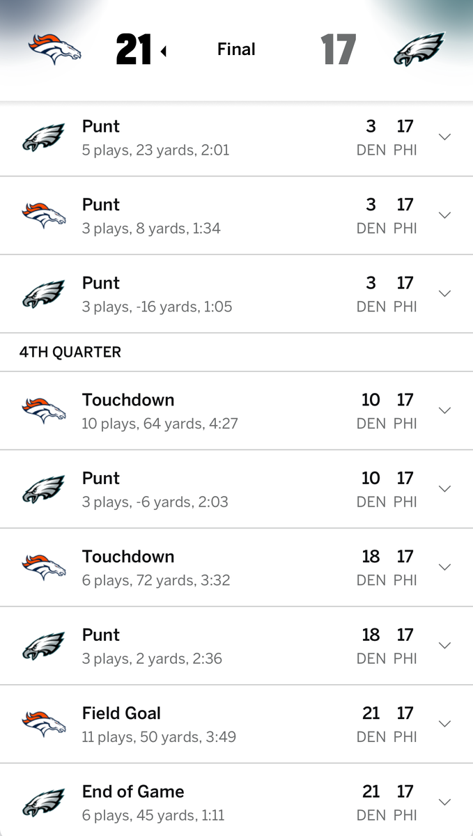 3 hours ago3 hr 1 minute ago, Aerolithe_Lion said:Was the defense concussed too? Why did Denver’s defense keep the pressure on but Philly’s burst like a frozen pipe?Jalen got worse as the game went on, the defense fell off a cliff as the game went onProbably had something to do with, at the time, the Eagles offense getting booed off stage like it's a throwback to the damn Apollo. The defense did not fall off a cliff, 21 is not falling off of a cliff.Let's try putting it on the defense when the offense response is not back to back to back three and outs. Cool?