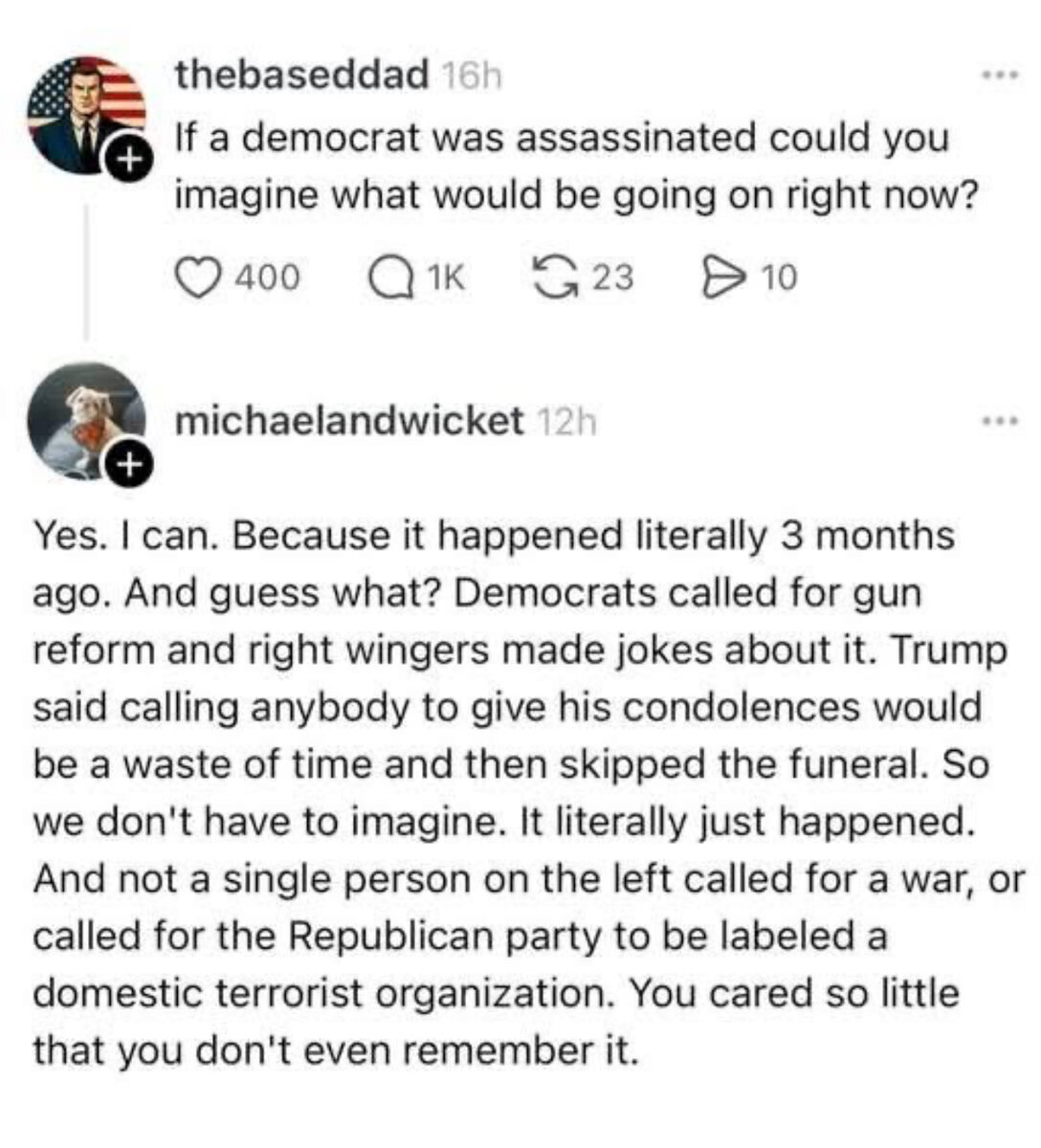 September 13, 2025Sep 13 18 minutes ago, Diehardfan said:Guarantee you he would. But is that the context and spirit that has been quoted here? No. So yeah as breaking news happens I post stories as I see them. Same as others have that were wrong about what he believed or his father being in the sheriff's office that was false. It happens.Well when people talk about the 2nd in this case I think some are absolutely implying that he might have a difference of opinion at this point. Others are using that to say "he deserved what he got" and that is another thing entirely.