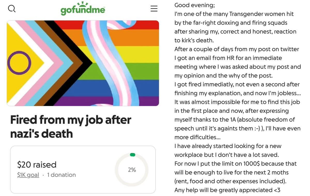 September 14, 2025Sep 14 Leftists who were fired for celebrating the death of Charlie Kirk are now resorting to begging for money and donations online through sites like GoFundMe and GiveSendGo.FAFO...