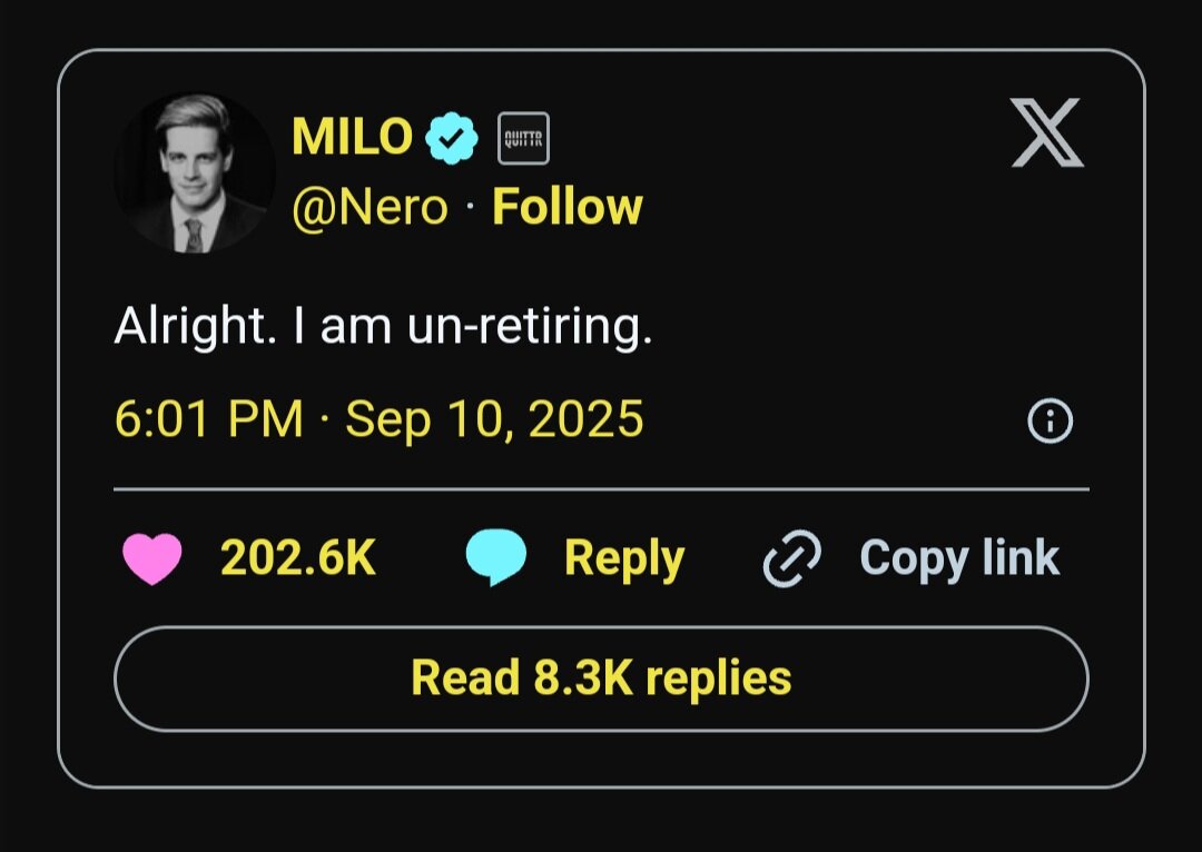 September 17, 2025Sep 17 21 hours ago, lynched1 said:This can't be good.Gasoline meet match.The following day, Yiannopoulos expanded on his intentions, writing, "I’d like to do a series of open-air events on US campuses this fall. Keen to hear from student groups and experienced promoters.” He also commented in the wake of Kirk’s death, "They killed the nice guy. Probably a tactical error.”Honestly, the fact that they call the guy who said the civil rights act is a mistake the 'nice guy' is a great example of how far this country has spiraled into the ground.I've said this before, I don't really have issues with conservatives in other countries of our wealth level, but I can't with American conservatives. While it's true that at this point American Liberals have joined them, American Conservatives haven't lived in reality for decades, because there's always something telling them that liberals are the devil (thanks, Fox News). Frankly, you can put the downfall of this country pretty much at the feet of the whole 'own the libs' origin situation where discourse was abandoned for rage bait. Since that started, discourse basically was flung into the sun and replaced with bad faith. Practically everything since then has been an escalation or counter-escalation. At that point people just said 'tough cookie, deal with it' which is fair, but unfortunately no political side in America is mature enough to leave it at that. Places outside of the country are, but not here.Toxic individualism is a great description of what's happening in this country. People can't handle being wrong due to fragile self-esteem, so they ignore evidence, seek to anger people who show why their views might be incorrect, and take out their frustrations on others. This is who we are as a country.