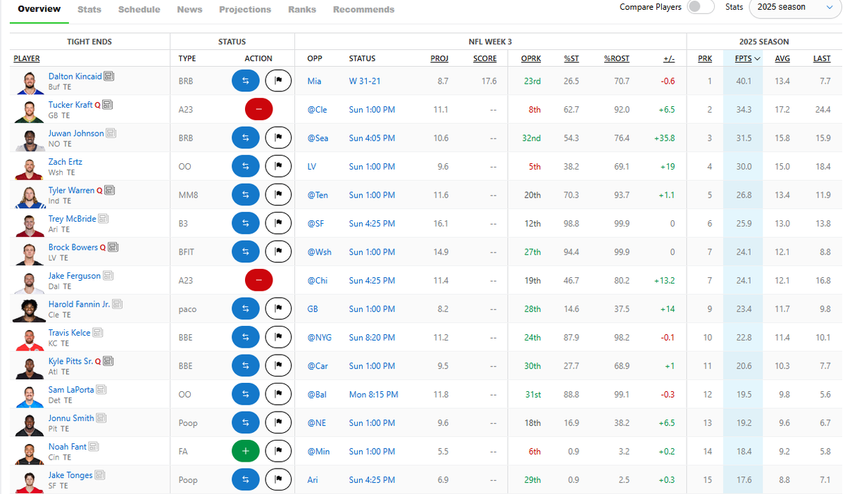 September 19Sep 19 3 hours ago, toolg said:What are you doing about the Tight End position? Kittle is on IR. Kelce is getting old. Hockenson is suffering from bad QB play. LaPorta is up and down. I guess if you splurged early in your draft for Bowers and McBride you are doing ok. But even they are not doing as good as advertised.What's your Tight End strategy? Have any advice?looks like several options including several names that could have been draft in round twenty (20)