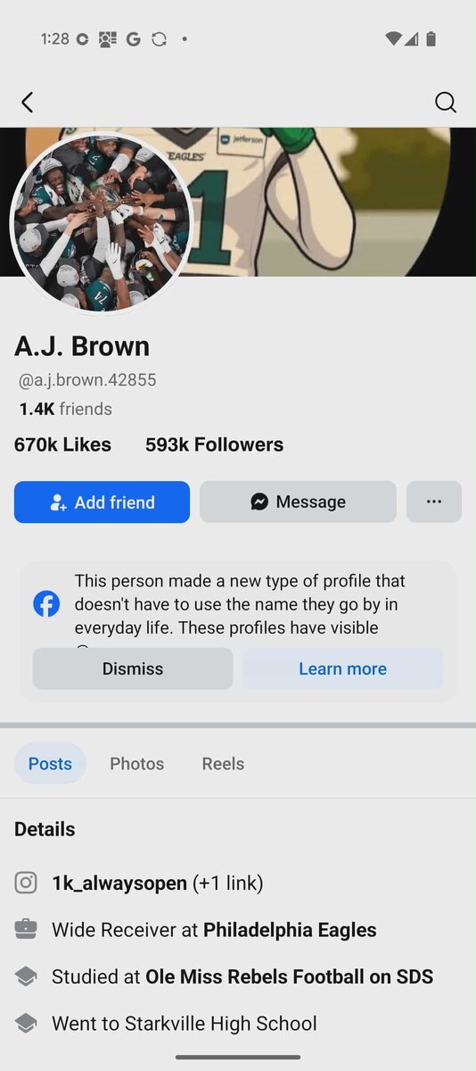 Monday at 05:51 PM3 days Just liked my buddies post. Check it before deleted. This was on the official eagles fb page. Verified the AJ Brown FB account is really is. 1st post, Eric Acevedo