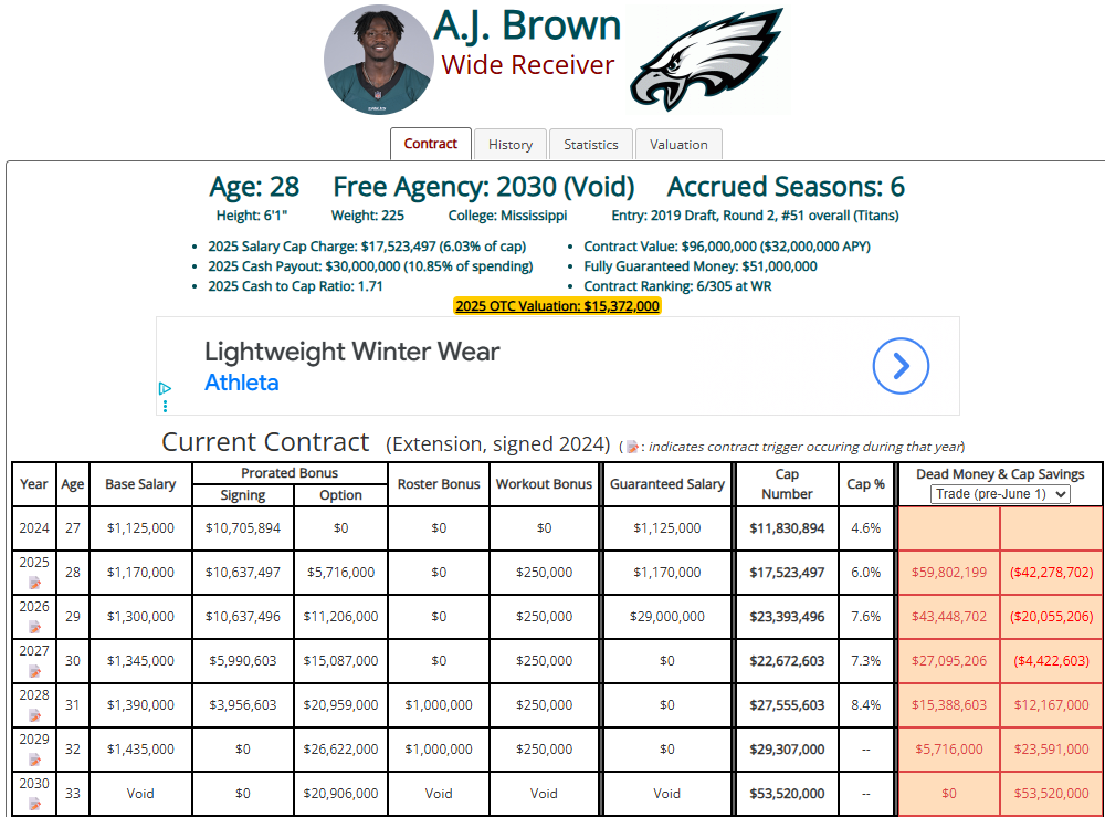 Saturday at 12:13 AM4 days 4 minutes ago, NOTW said:It's actually 43m, the 23m is just his regular cap number.https://overthecap.com/player/a-j-brown/78424 minutes ago, NOTW said:It's actually 43m, the 23m is just his regular cap number.https://overthecap.com/player/a-j-brown/7842Makes it even more unlikely then. There is nothing showing the team has a problem with him, just fans and media driven nonsense. once again till he actually comes out and says he wants a trade he isn't going anywhere.