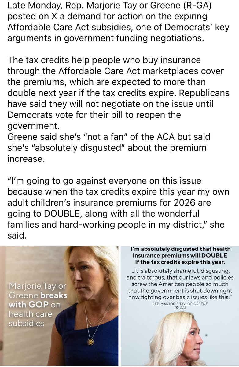 October 8Oct 8 14 hours ago, Nice Work Pal said:The Dems should let people’s healthcare costs go through the roof. Sometimes a little pain is necessary for change. Meanwhile:her, of all people in her party, is making sense?