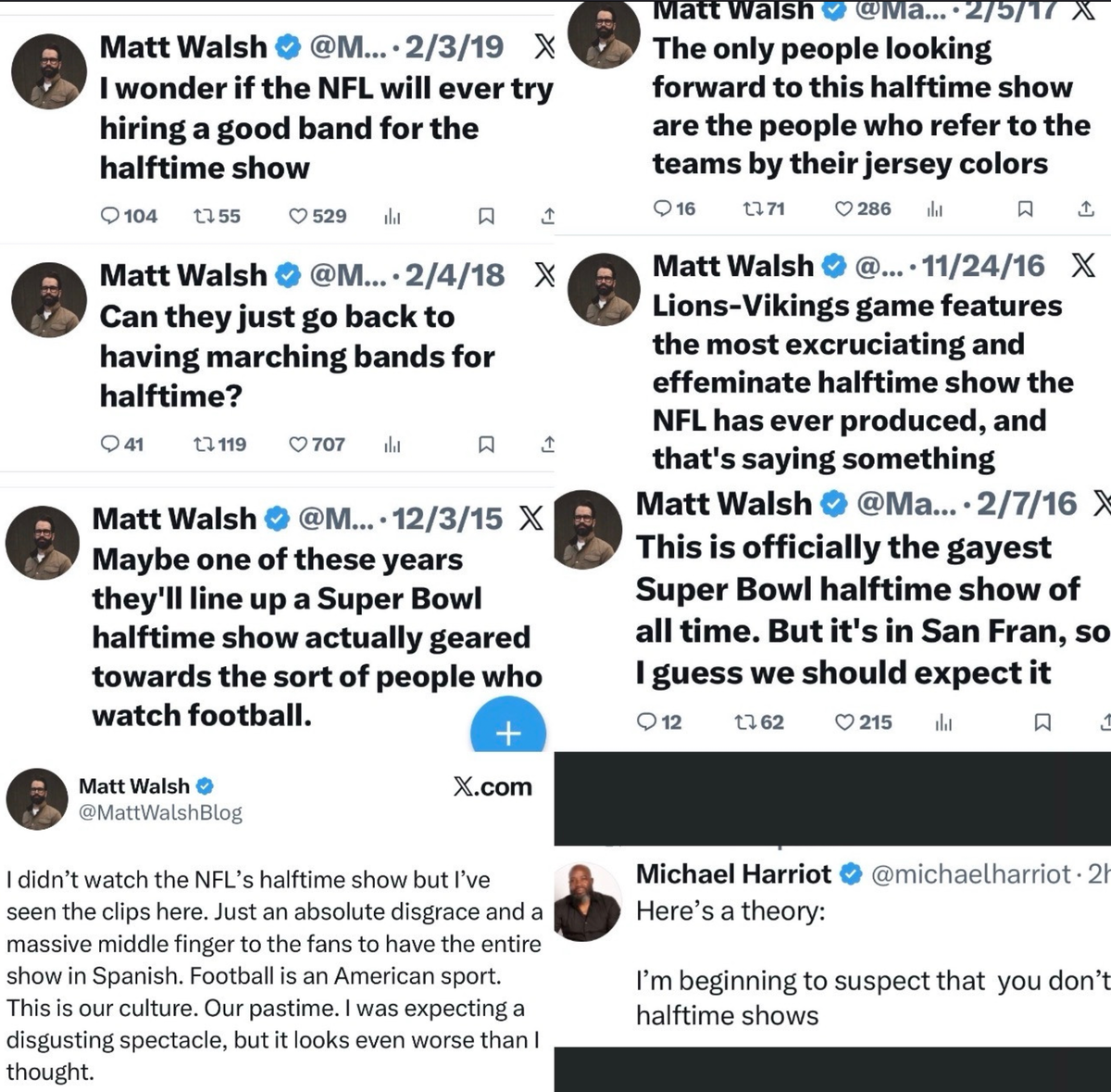 February 9Feb 9 2 minutes ago, Poopy said:And how many of the actual football fans care about the HT show? They're catering to those that don't and Bad Bunny is extremely popular.Basically none. The halftime show is mainly for women.Mike knows all this though. He's just mad because Trump told him he had to be.
