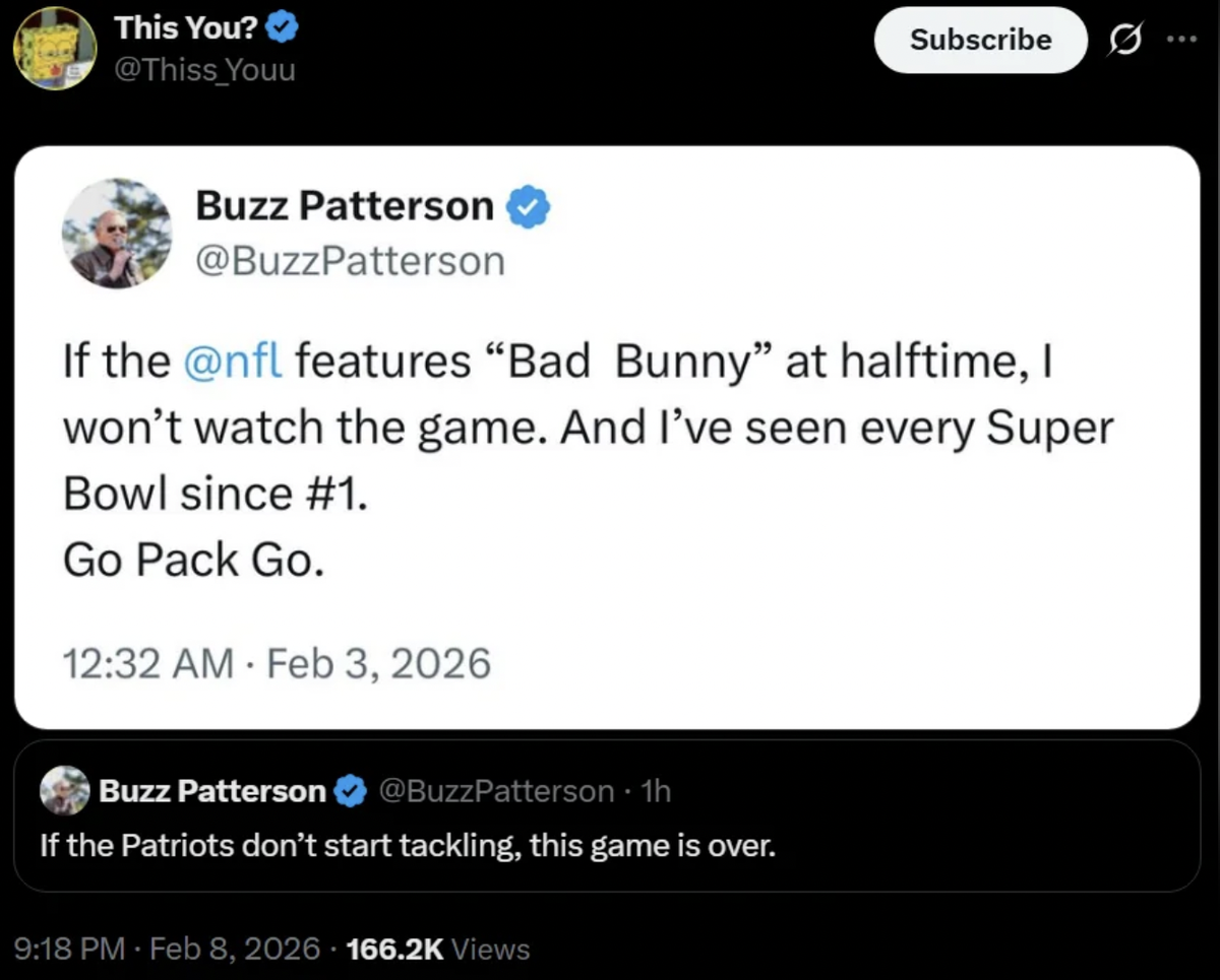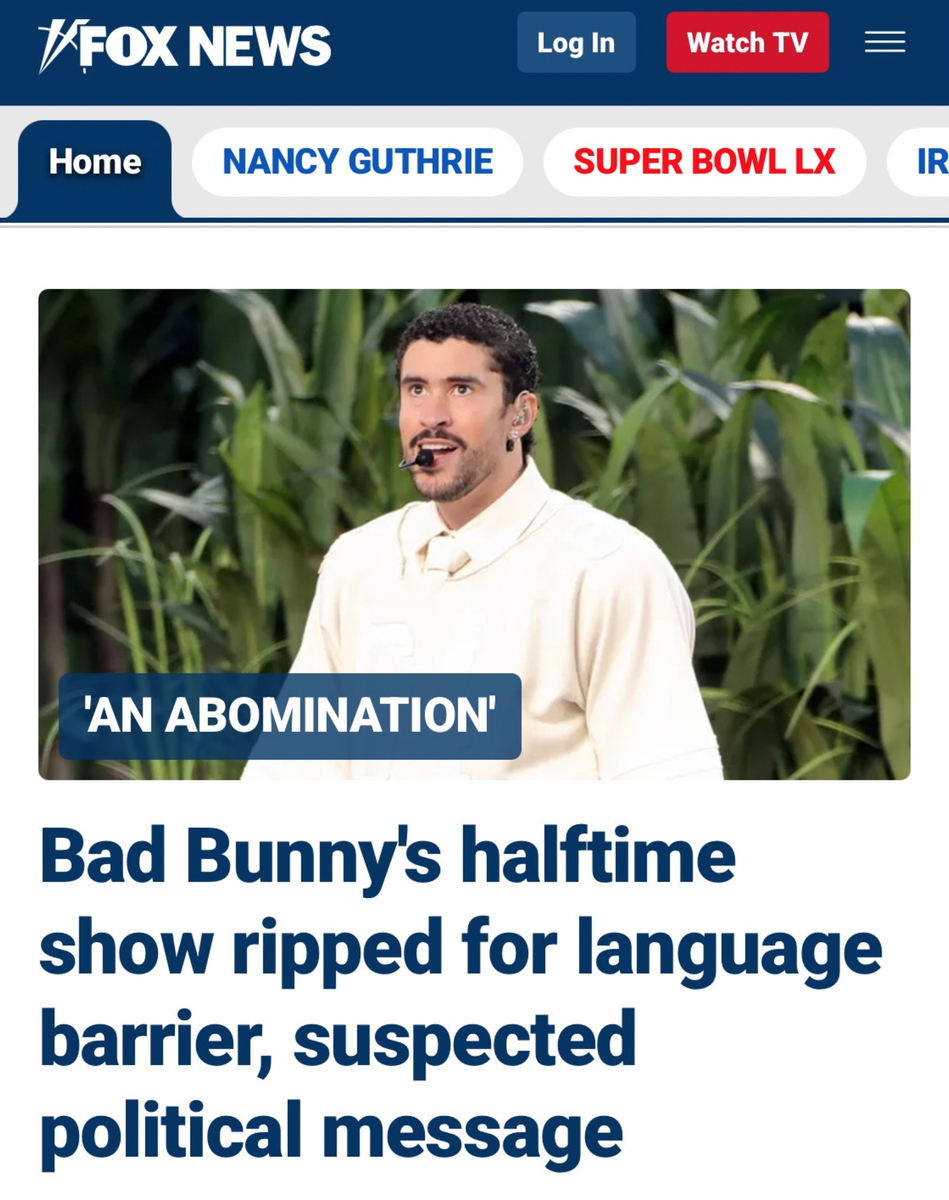 February 9Feb 9 Seeing all the middle aged or older pasty white dudes fangirling over Bad Bunny because of his political messages is lame AF (looking at you, Les Bowen). It’s ok to sit this one out.