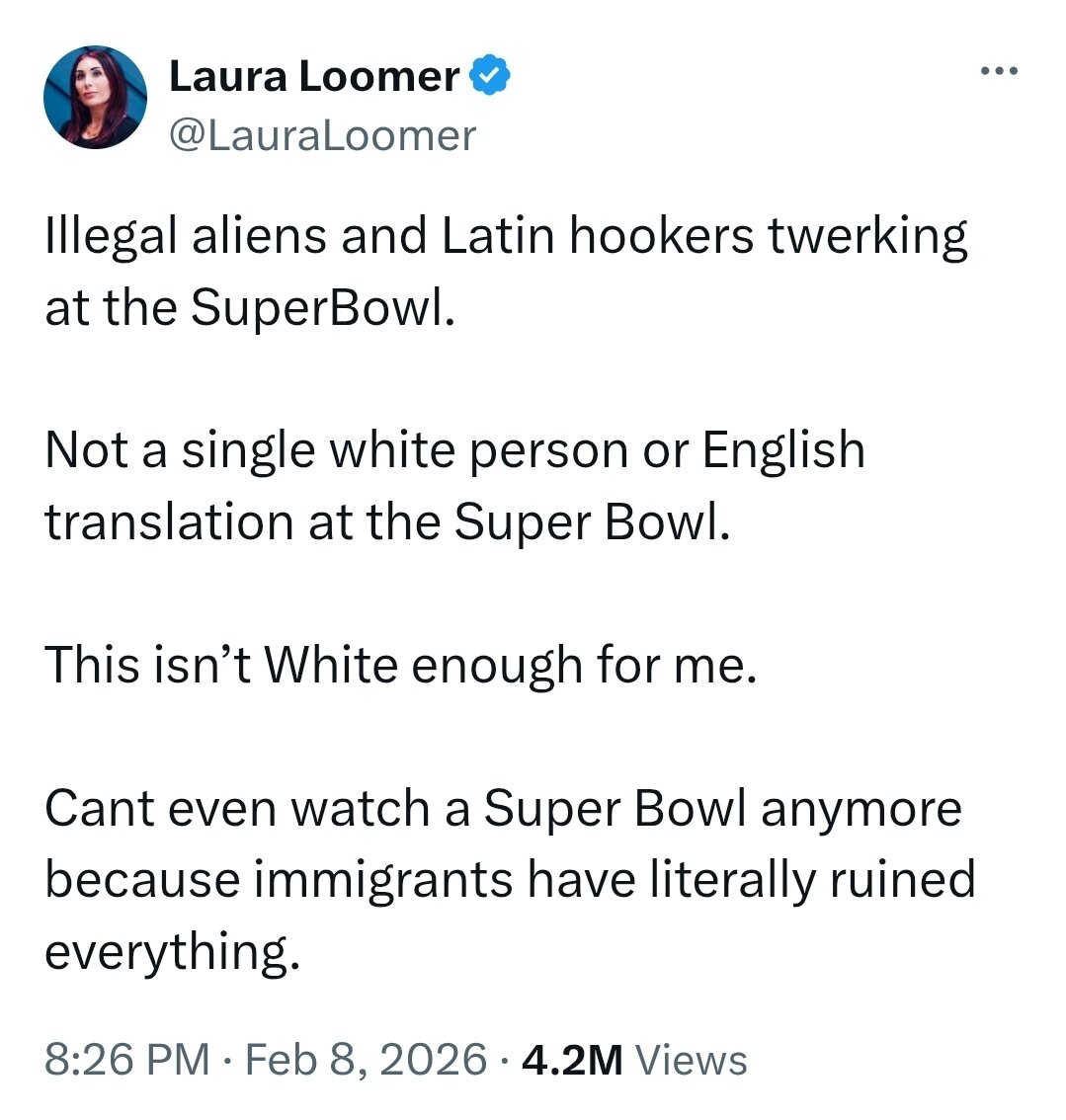 February 9Feb 9 10 minutes ago, Mike31mt said:The game was in San Francisco not Puerto Rico. It made absolutely no sense but halftime shows are usually terrible anyway so whateverLaura Loomer shares your sentiments, you boob pig.