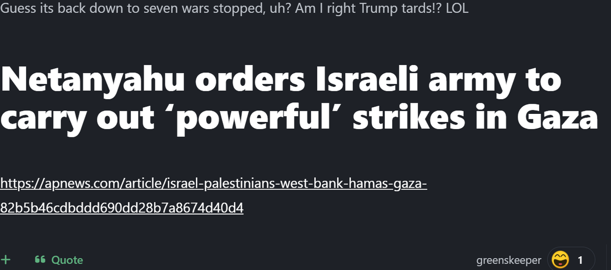 October 9, 2025Oct 9 Die Hard fan is just very low IQ with some undiagnosed mental illness. Lynched is drunk, poor and stupid. Greenskeeper I have always thought is legitimately retarded drooling over himself in front of a computer terminal in a group home somewhere.