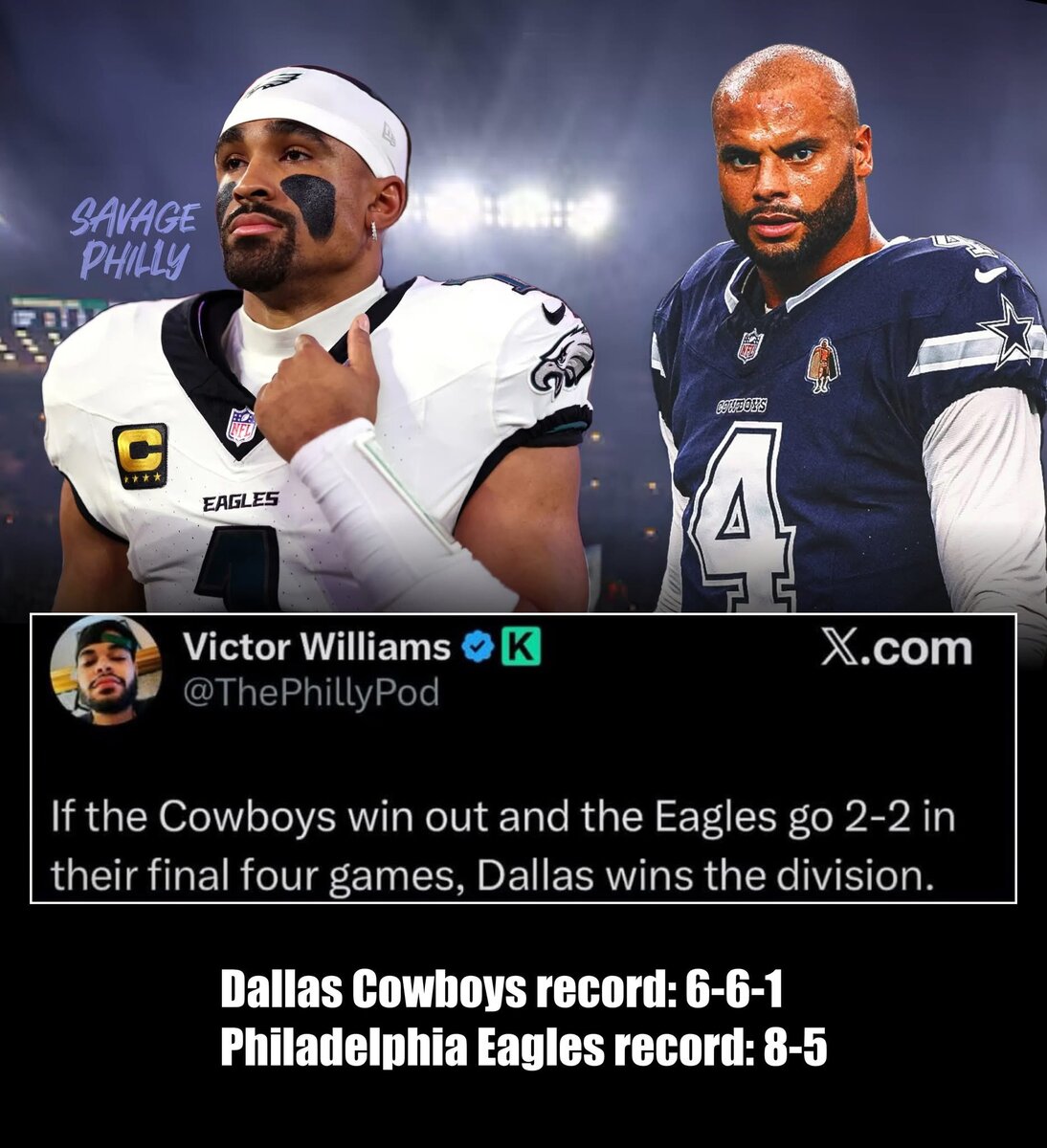 December 9, 2025Dec 9 Author 1 hour ago, Geemen said:HAHAHA. the eagles have a 3 game lead on the cowboys and a 93% playoff chanceMath isn't a strength of yours.Eagles 8-5Cowboys 6-6-1That's a 1.5 game lead. With 4 to go.